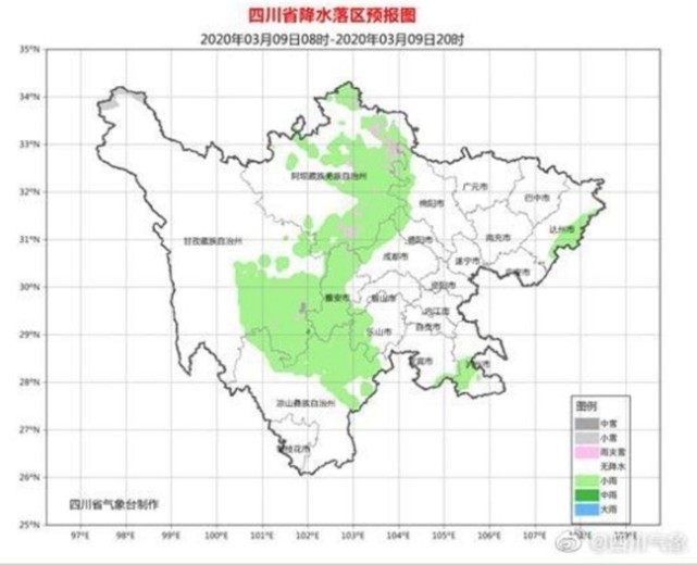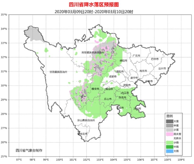 明天(3月9日)白天,盆地各市以多云天气为主,盆周山区有小雨或零星小雨;阿坝州东部和甘孜州东部多云间阴有阵雨(雪),川西高原其余地方以多云天气为主;凉山州东北部阴天间多云有阵雨,攀西地区其余地方多云间晴。