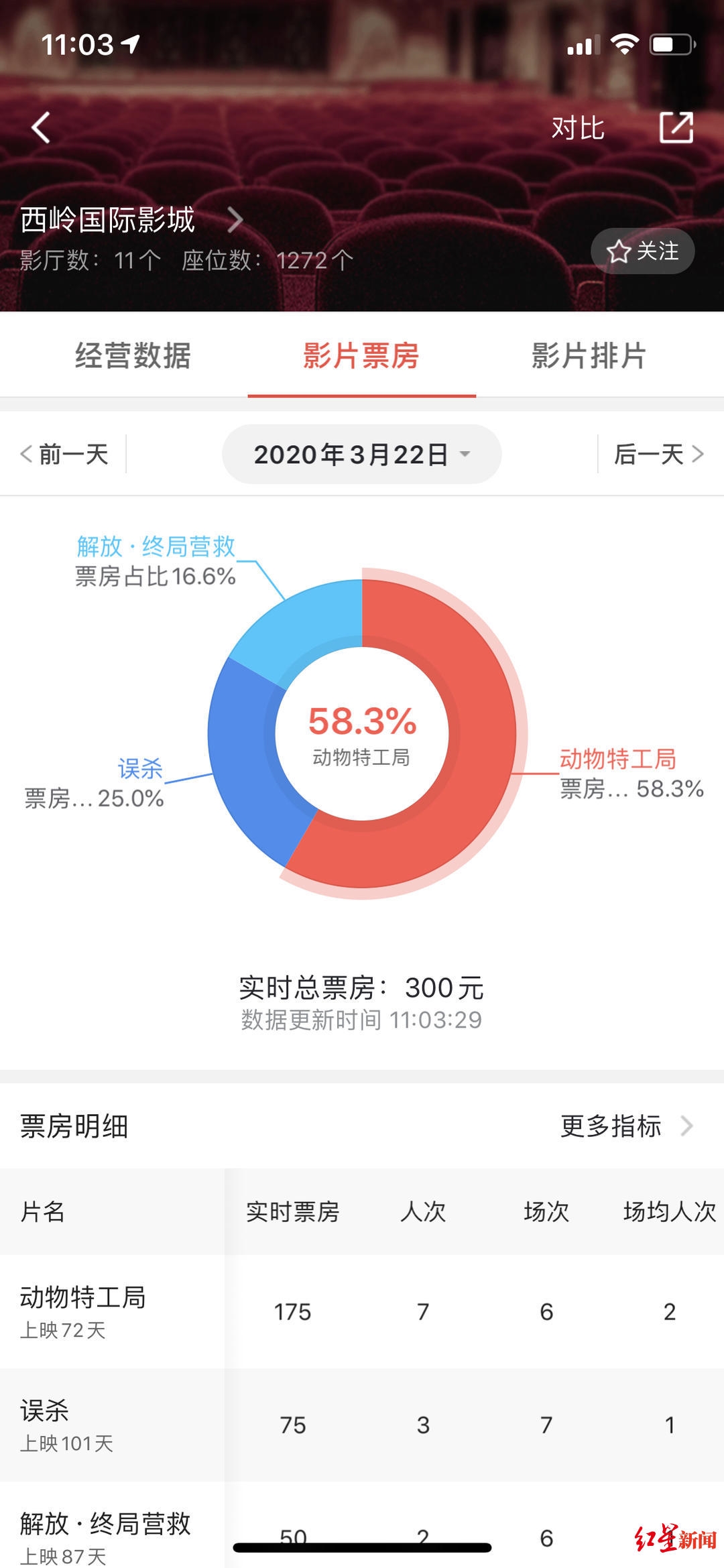 红星新闻记者在猫眼专业版看到,当日该影城排了《动物特工局》《解放·终局营救》《误杀》三部电影,截至红星新闻记者发稿时,该影城当日售出电影票12张,实时票房300元。