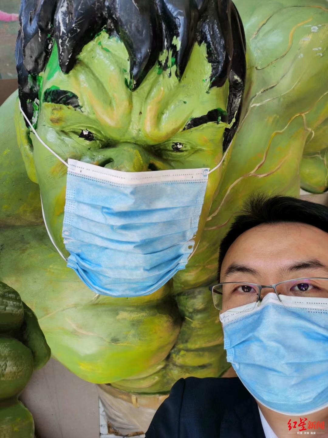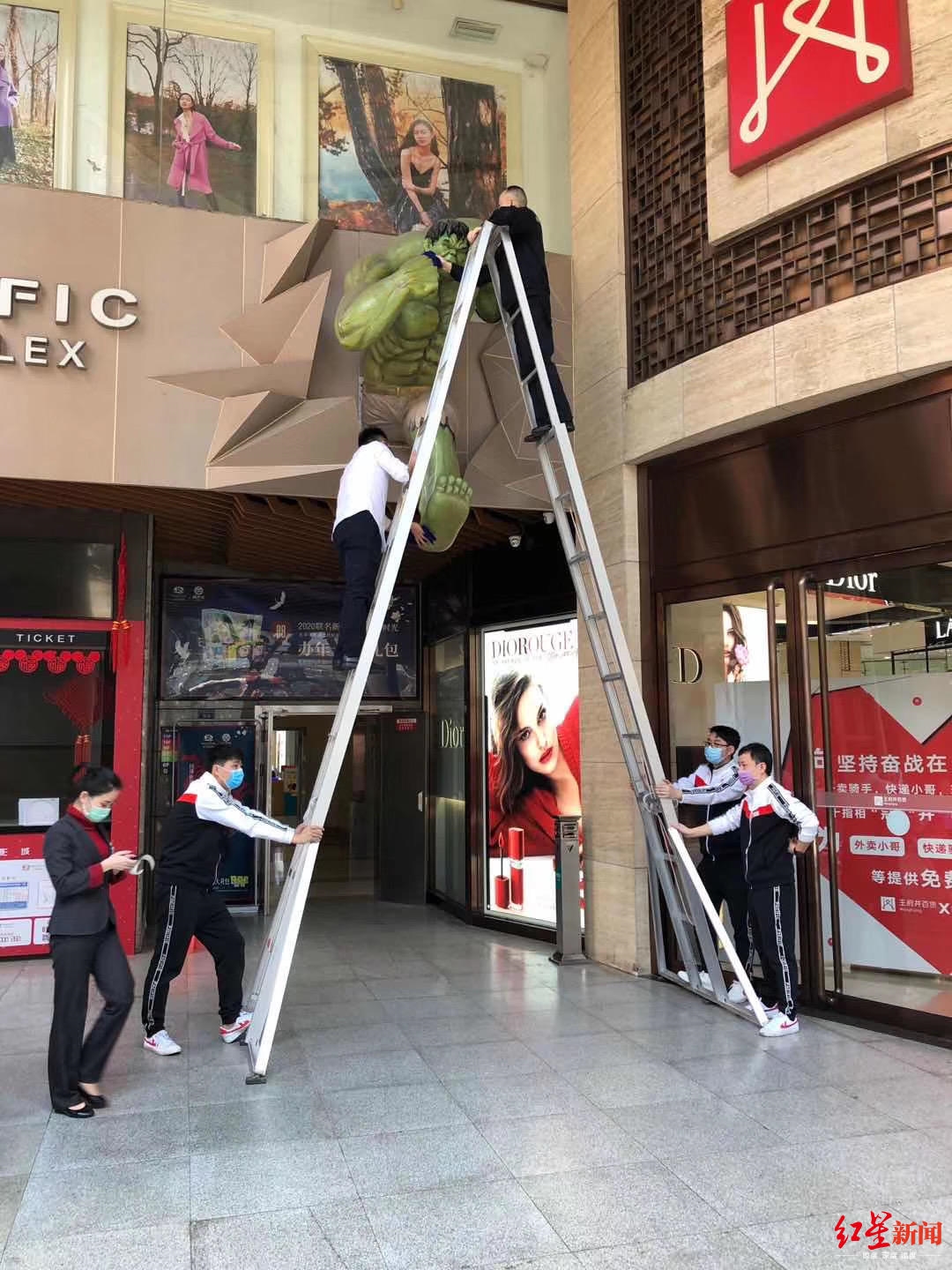 太平洋影城(王府井店)为绿巨人消毒、戴口罩(影城供图)