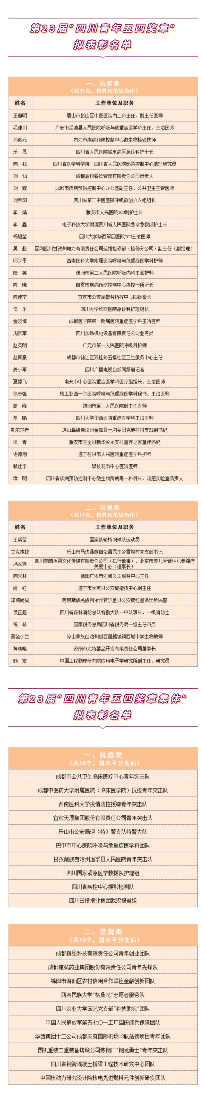 四川新闻网成都4月20日讯(记者 文骥)4月20日,记者从团省委官方微博获悉,经各地各单位积极申报,通过资格审核、事迹展示和大众评审会、专家评审会两轮投票,拟授予王道明等42名个人第23届“四川青年五四奖章”、成都市公共卫生临床医疗中心青年突击队等20个团队第23届“四川青年五四奖章集体”,现予以公示。