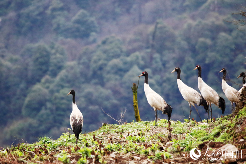 “鸟中大熊猫”黑颈鹤现身四川乐山。王琦摄人民网成都3月29日电 3月25日至26日,13只国家一级保护动物黑颈鹤现身四川省乐山市金口河区八月林自然保护区。3月27日,这群“小精灵”又来到了金口河区的大瓦山国家湿地公园。据了解,黑颈鹤别名藏鹤、雁鹅、黑雁等,栖息于海拔2500-5000米的高山湖泊、沼泽、草甸等地,是世界......
