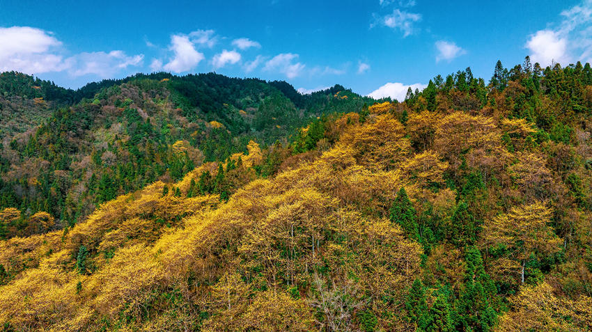 四川宣汉:千亩檫木花开 上演春日里的“金色童话”