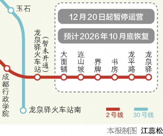 记者15日获悉,因成渝中线高铁以及铁路十陵南站建设需要,成都地铁2号线东段将实施改建,大面铺站、连山坡站、界牌站、书房站、龙平路站、龙泉驿站6个站点将自12月20日起暂停运营,成都将推出包括提前开通2条地铁新线、开行10条公交快线、新建停车场等多项措施保障市民交通出行。 此外,成都轨道交通30号线、13号线一期1......
