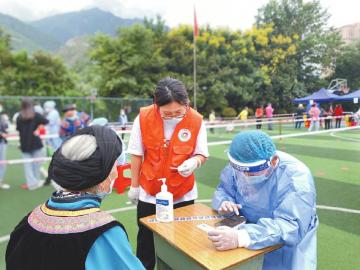 阿坝州社会工作者和医务人员为老人做核酸检测。阿坝州友邦社会工作服务中心供图 直击坚守 “要19份盒饭……”9月5日11时过,在阿坝州马尔康市马尔康镇美谷街社区,网格员向华通过电话向社区反复叮嘱当日的用餐数量,“里面还有两份要给一位老人送去。” 12时10分左右,盒饭送到。“今天有点耽搁,老人肯定饿了,要搞快点......
