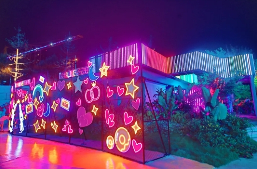 天黑之后,时光隧道变得更加五彩斑斓。从远处看就像是发着光的外太空隧道,桃红色的外观一眼就能抓住眼球