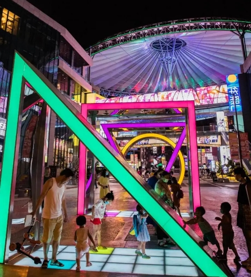 用4组哈哈镜呈现不同的视觉扭曲效果。在这里可以变大变小,拉长缩短,总有一款你喜欢的。些许小烦恼,都可以在这里找到快乐的自己吧~晚上的哈哈镜就更有趣了。用脚能踩出“一道彩虹,因吹斯汀!