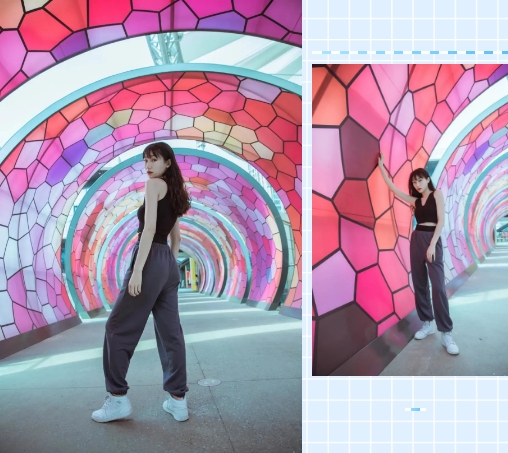 桃粉色为主调的时光隧道,色彩简洁呈几何构图,缝隙之间透出的光影错落有致。整个空间非常大,无论是站在中间还是靠在上面,怎么拍都好看。